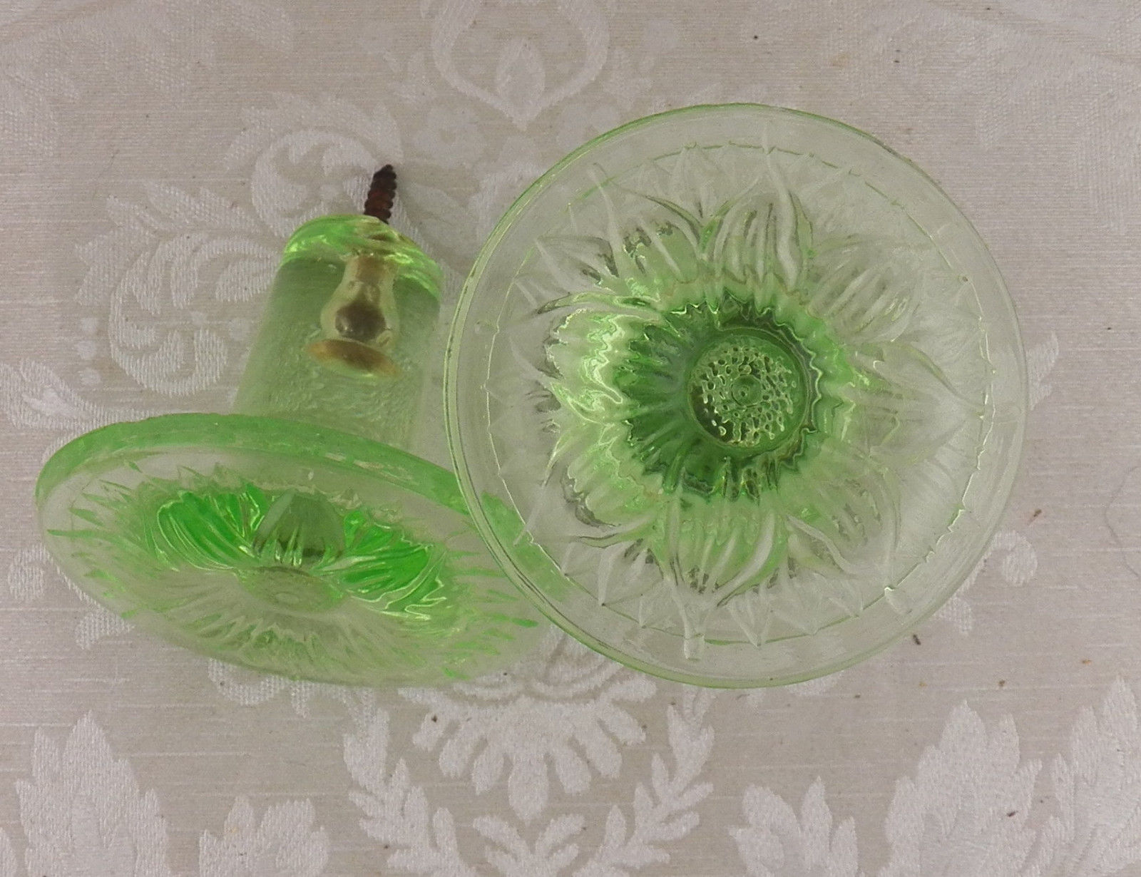 Title (ebay affiliate link): DEPRESSION GREEN PATTERN GLASS TIEBACKS HOLDBACKS