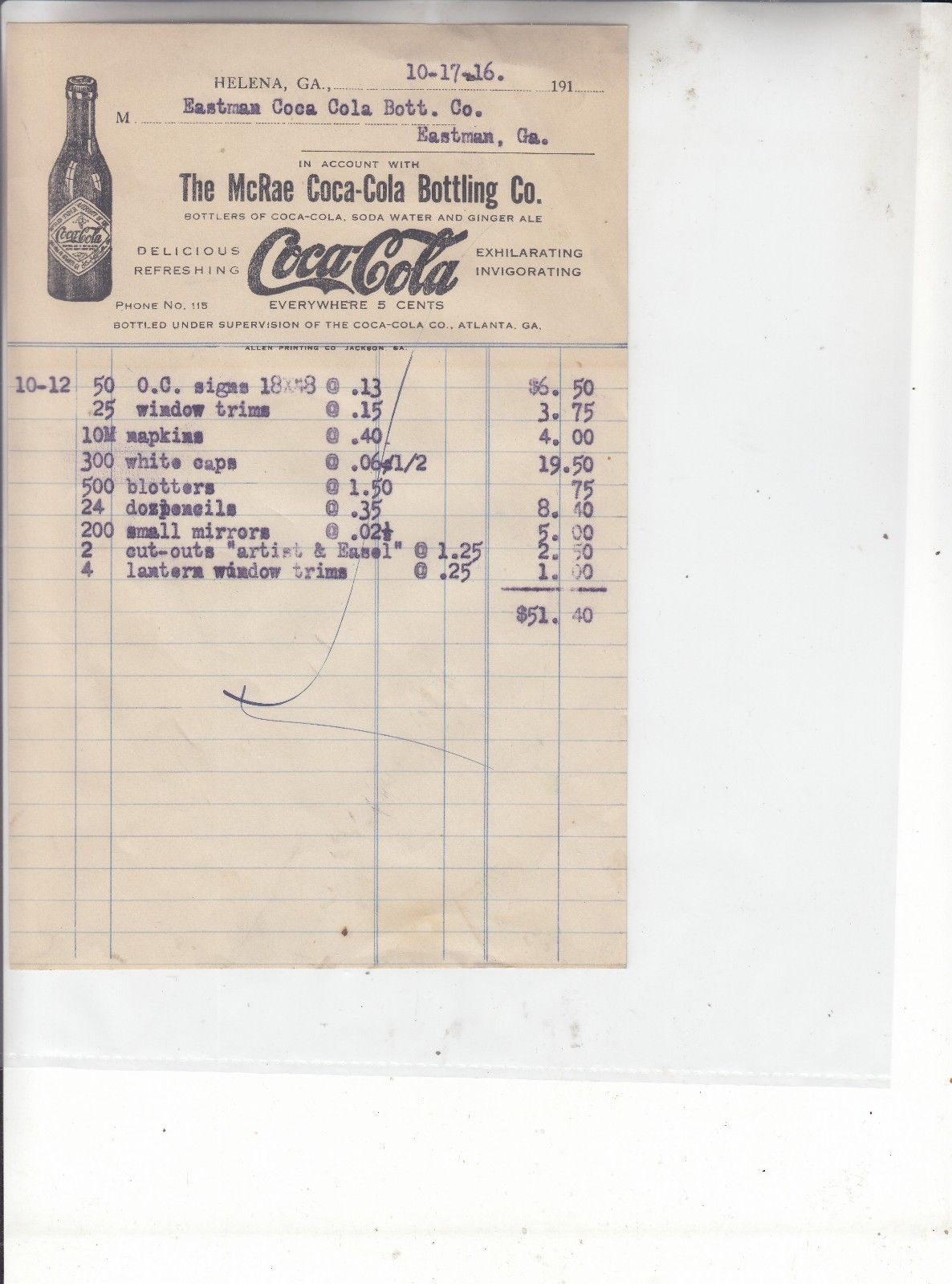 Title (ebay affiliate link): THE McRAE COCA-COLA BOTTLING CO. INVOICE . DATED 10 - 17 -16