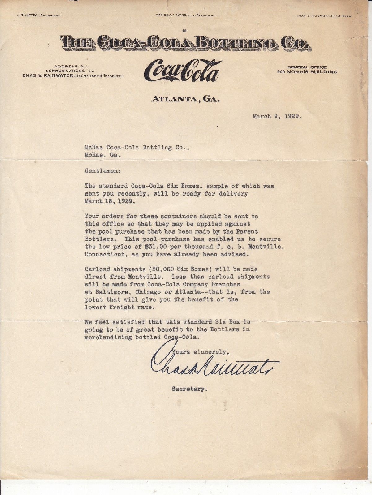 Title (ebay affiliate link): THE COCA-COLA BOTTLING COMPANY ATLANTA GA. .LETTERHEAD DATED MARCH 9, 1929