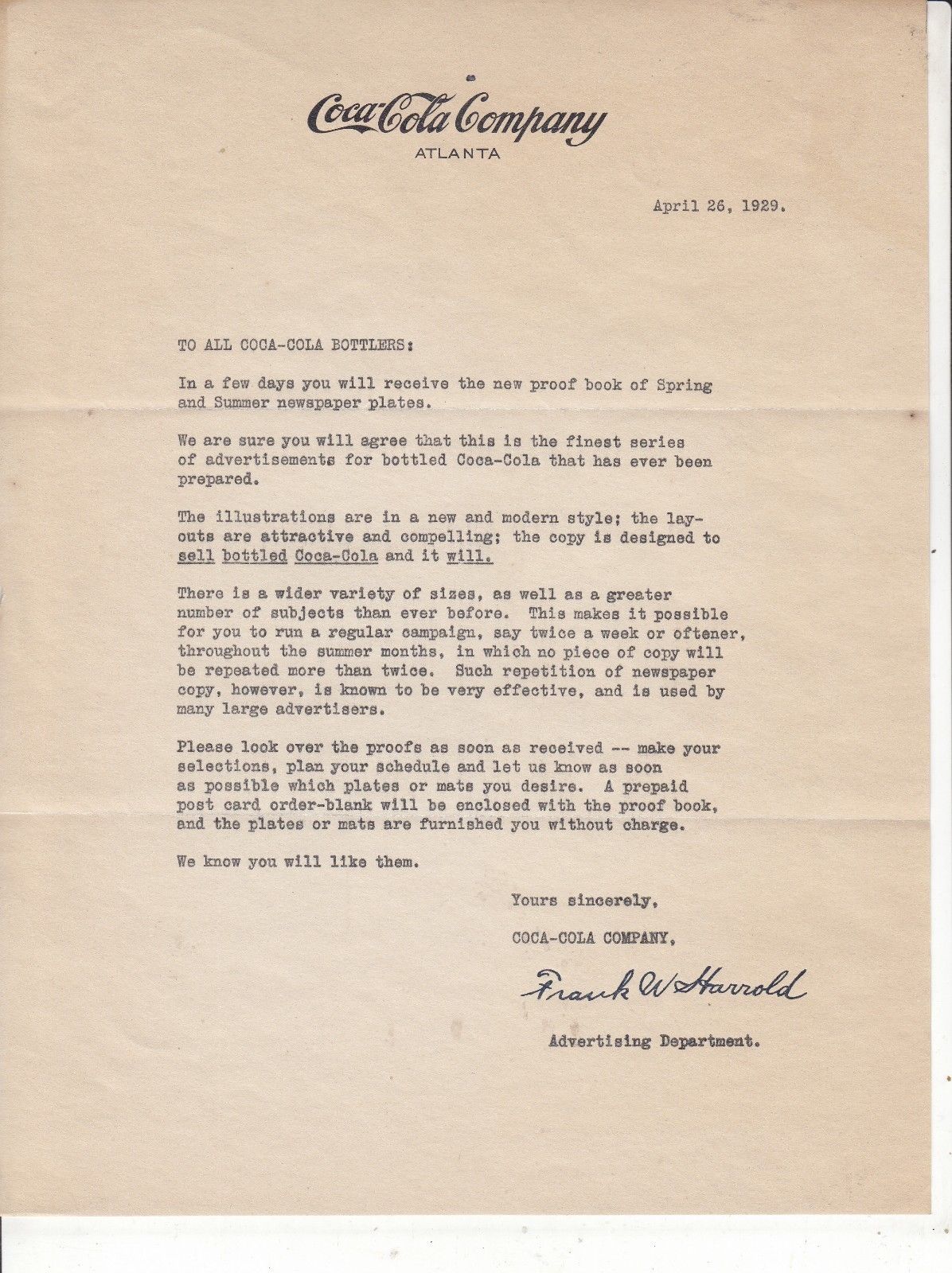 COCA-COLA COMPANY ATLANTA GA. .LETTERHEAD DATED APRIL 26, 1929
