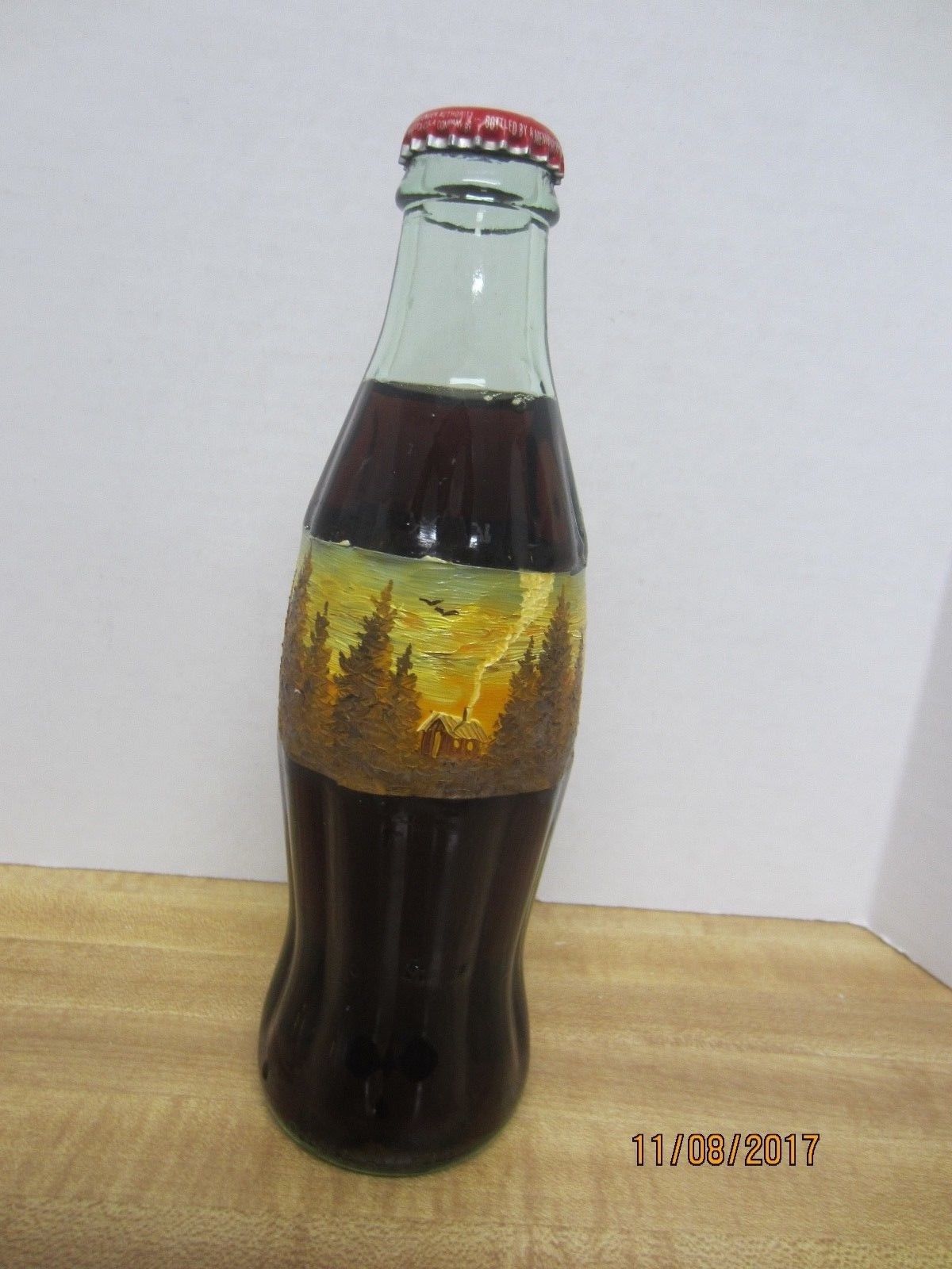 Title (ebay affiliate link): COCA COLA * SPECIAL HANDPRINTED * COKE BOTTLE * AUTUMN CABINS 8oz Glass