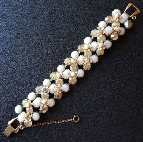 Title (ebay affiliate link): Vintage 7" Bracelet Flower Enamel Tier Milk Glass Cabochon AB Rhinestone F105