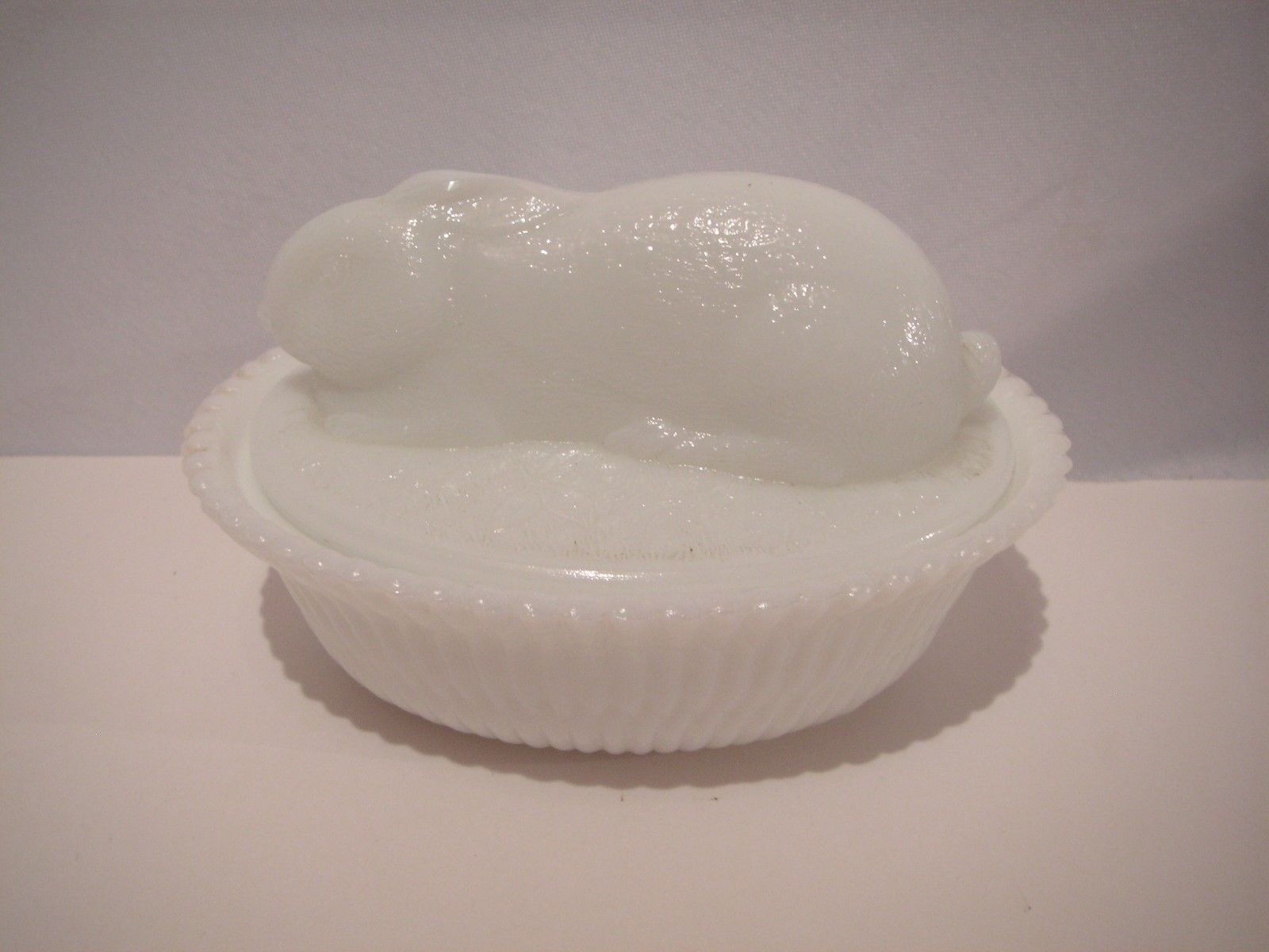 MILK GLASS RABBIT COVERED DISH, MCKEE