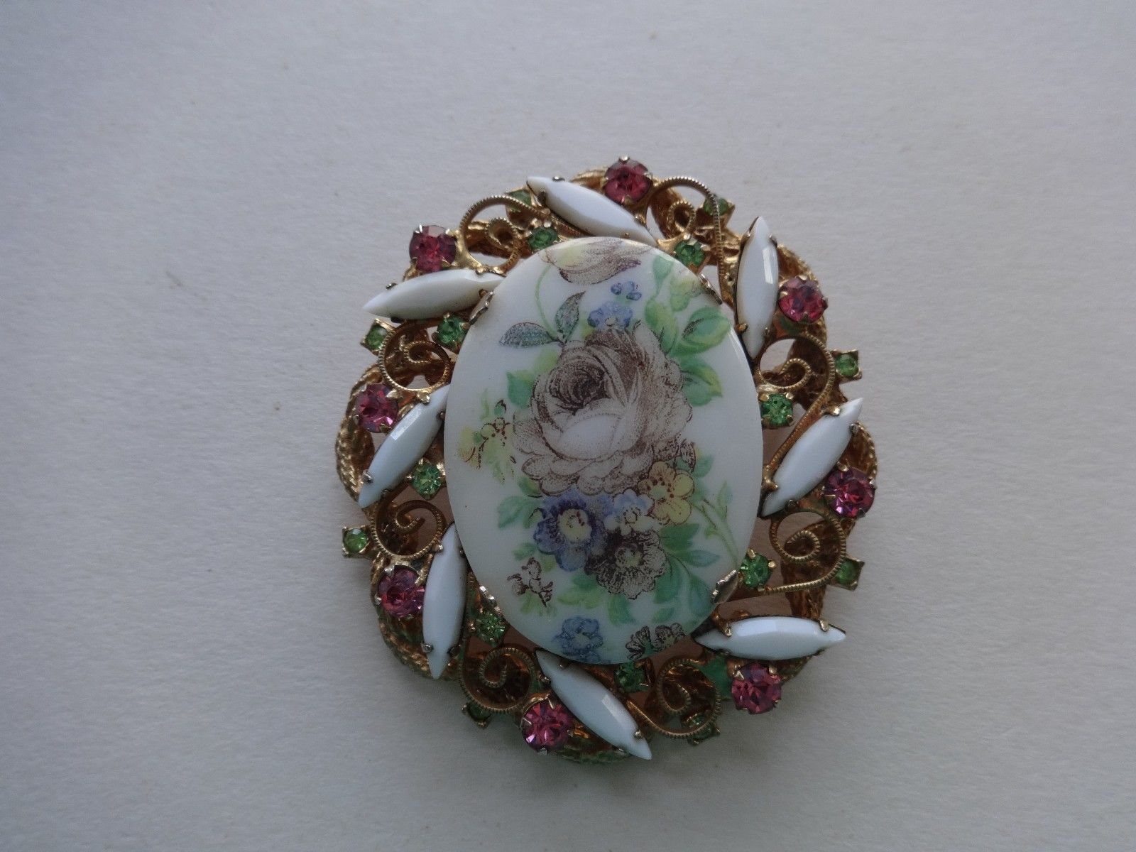 Title (ebay affiliate link): Vintage Juliana Milk Glass Fruit Salad Rhinestone Antique Style Oval Pin/Brooch
