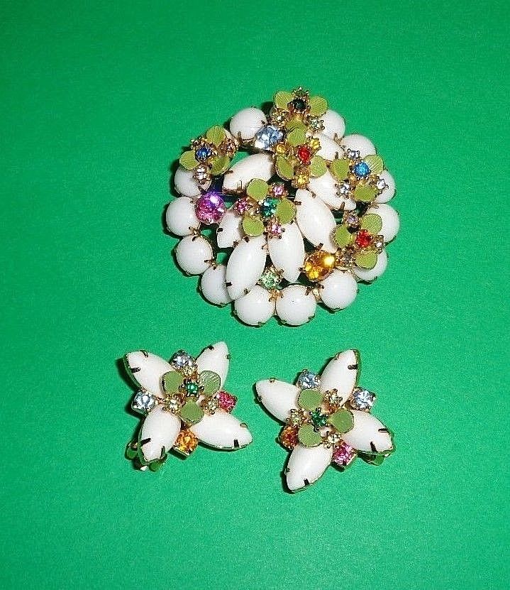 Title (ebay affiliate link): VINTAGE MULIT COLOR RHINESTONES MILK GLASS NAVETTES GOLDTONE SET
