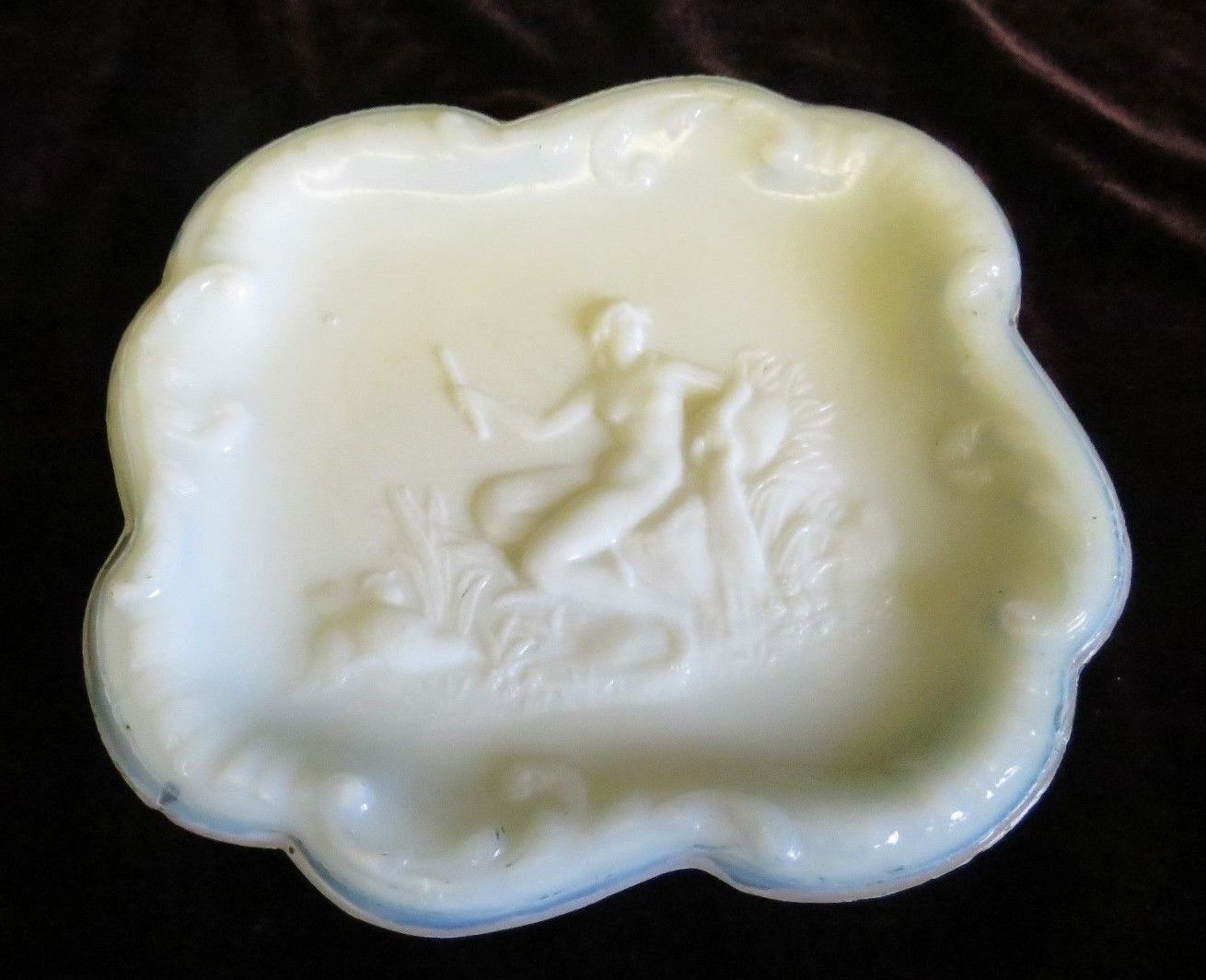 Title (ebay affiliate link): Victorian Milk Glass Plate nude pouring water w/ birds 7 1/2"