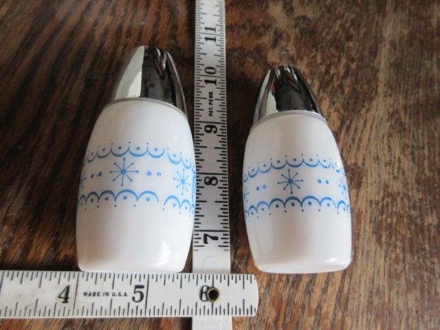 Title (ebay affiliate link): Vintage GEMCO Milk Glass Pyrex Blue Snowflake Salt And Pepper Shakers -1971