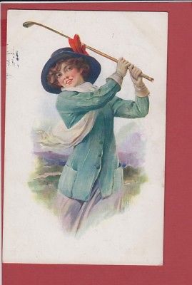 Old Postcard lady in Costume Playing Golf Artist Signed