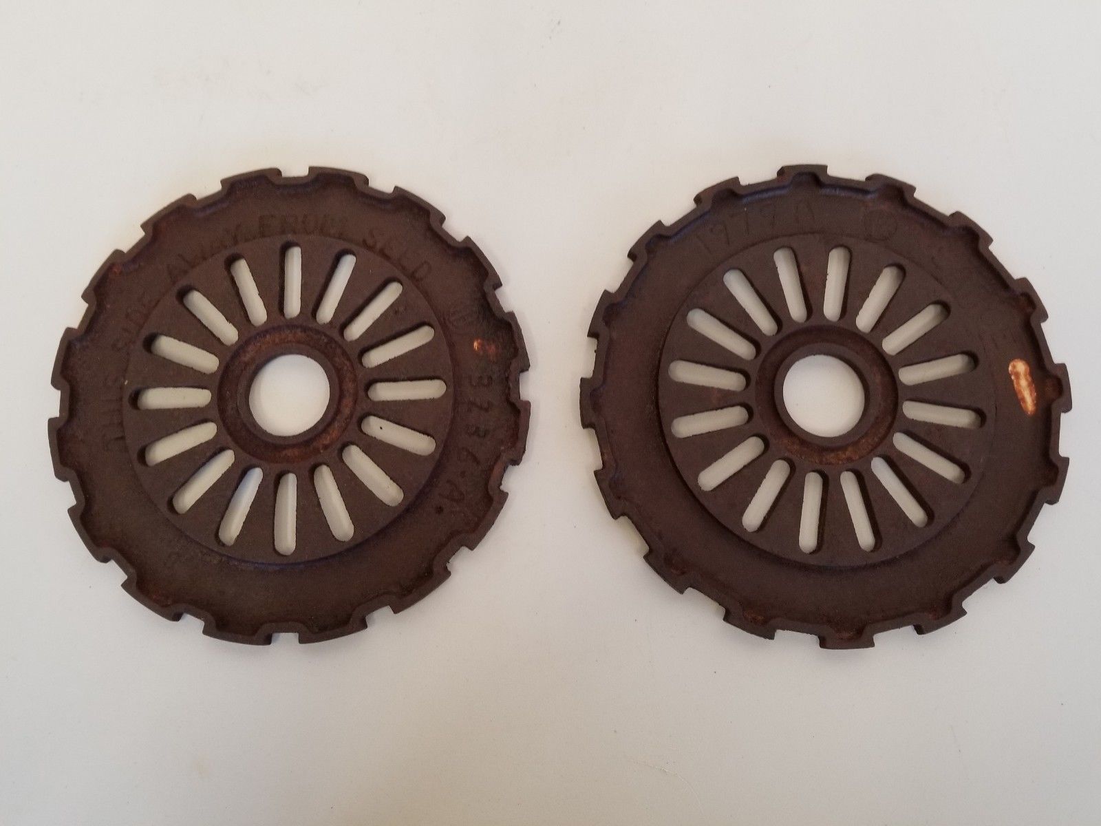 2 Antique Cast Iron Case IH Corn Planter Plates ~ Vintage Primitive Farm Wheels