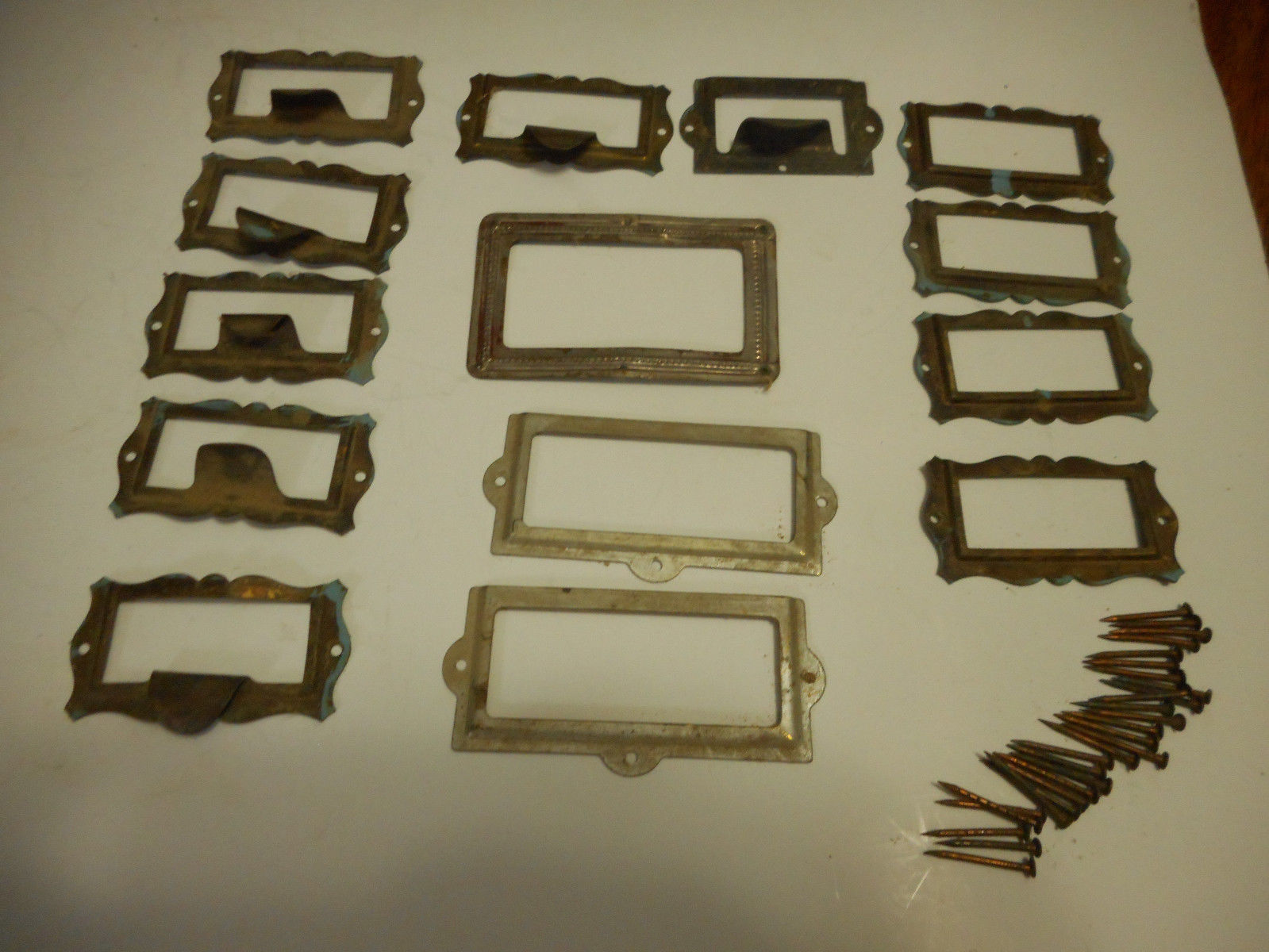 Title (ebay affiliate link): Lot of 14 vintage solid stamped brass library card catalog drawer