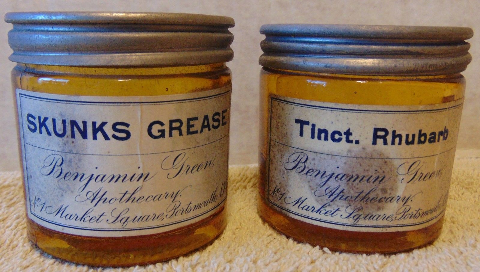 Title (ebay affiliate link): Two Apothecary Jars. Skunks Grease & Tinctured Rhubarb. Portsmouth N.H