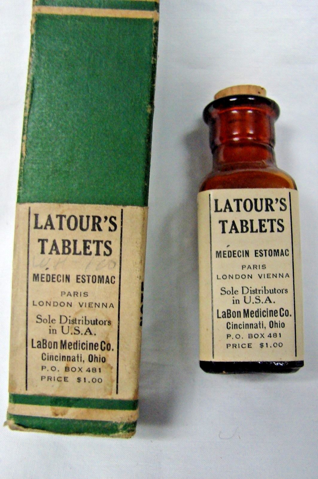 ANTIQUE EARLY 1900s LATOUR''S TABLETS MEDICINE BOX & AMBER BOTTLE