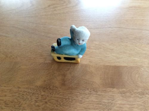 Vtg. Antique Bisque Snow Baby Girl On Sled, Blue Snowsuit Embossed Japan EXCELLE