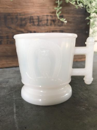 Title (ebay affiliate link): Victorian Eastlake Atterbury & Co Milk Glass Owl In Horseshoe Handled Mug 1880''s