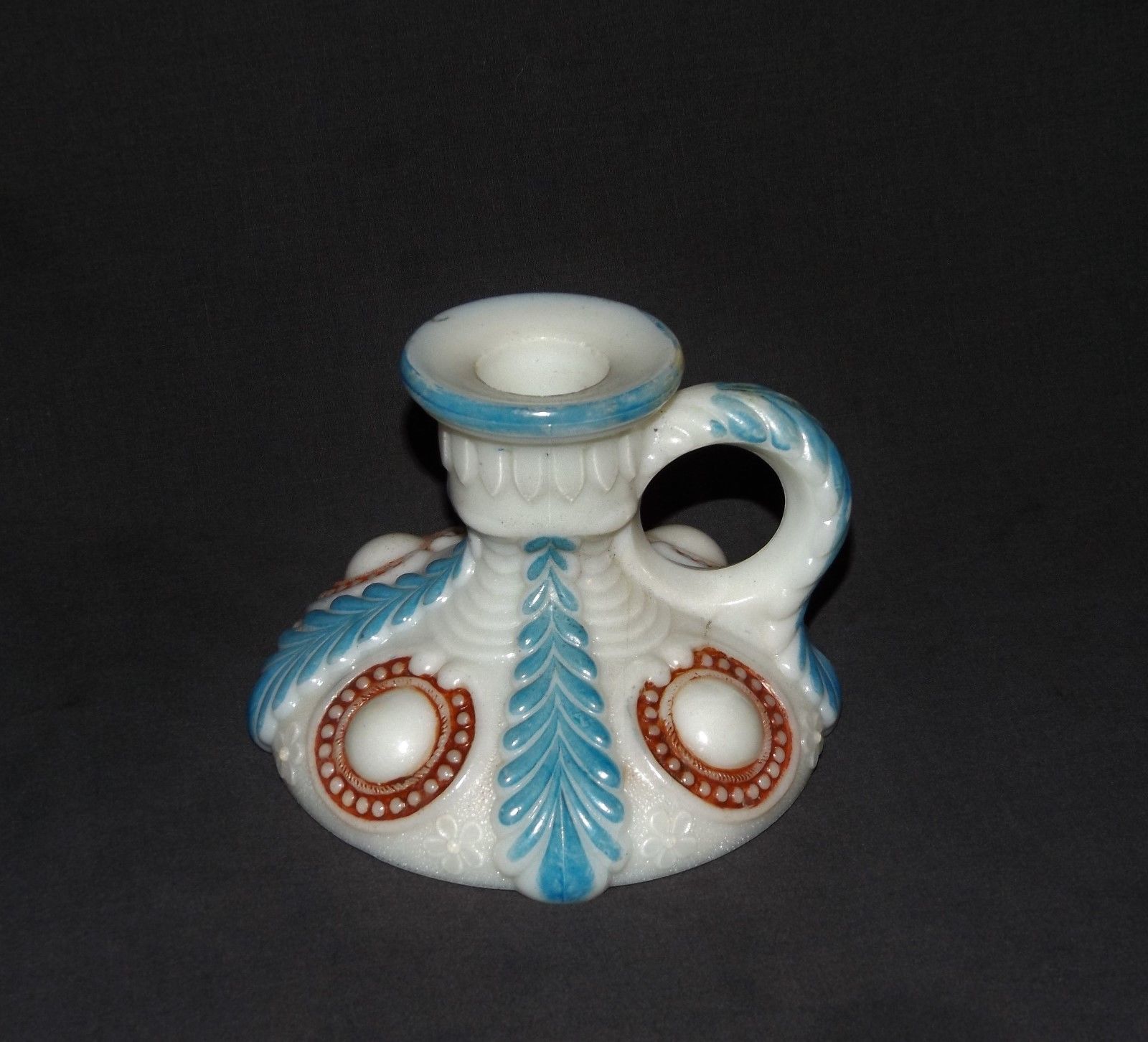 ANTIQUE CANDLE LIGHT Painted EAPG Feather Milk Glass FINGER CANDLESTICK HOLDER