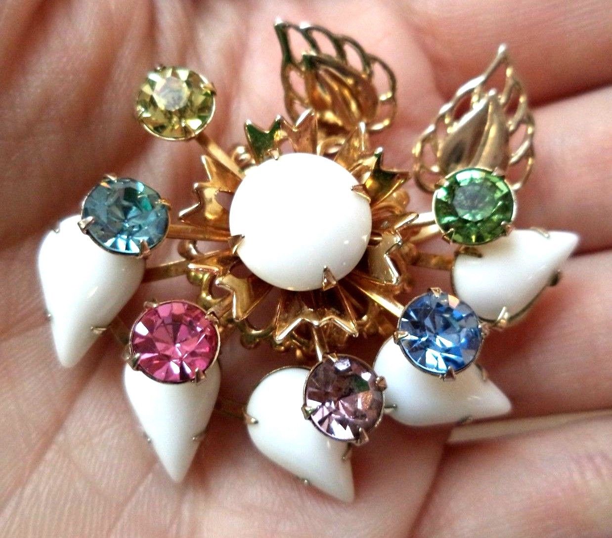 Title (ebay affiliate link): VINTAGE ESTATE HIGH END MILK GLASS RHINESTONE FLOWER 1 7/8" BROOCH!!! G6663P