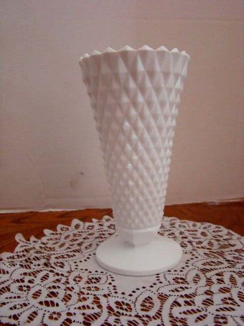Title (ebay affiliate link): Diamond Cut Milk Glass 8"Vase with Sawtooth Edge -- PERFECT CONDITION