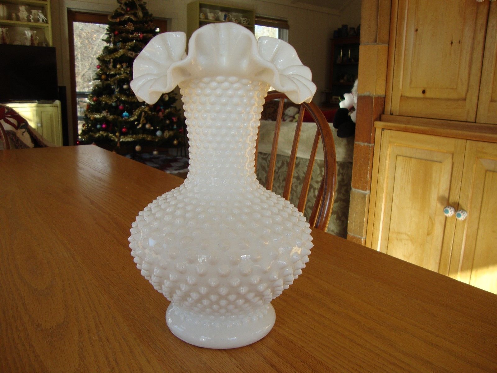 Title (ebay affiliate link): 11" TALL VINTAGE FENTON HOBNAIL WHITE MILK GLASS RUFFLED VASE PRE-LOGO 1950s