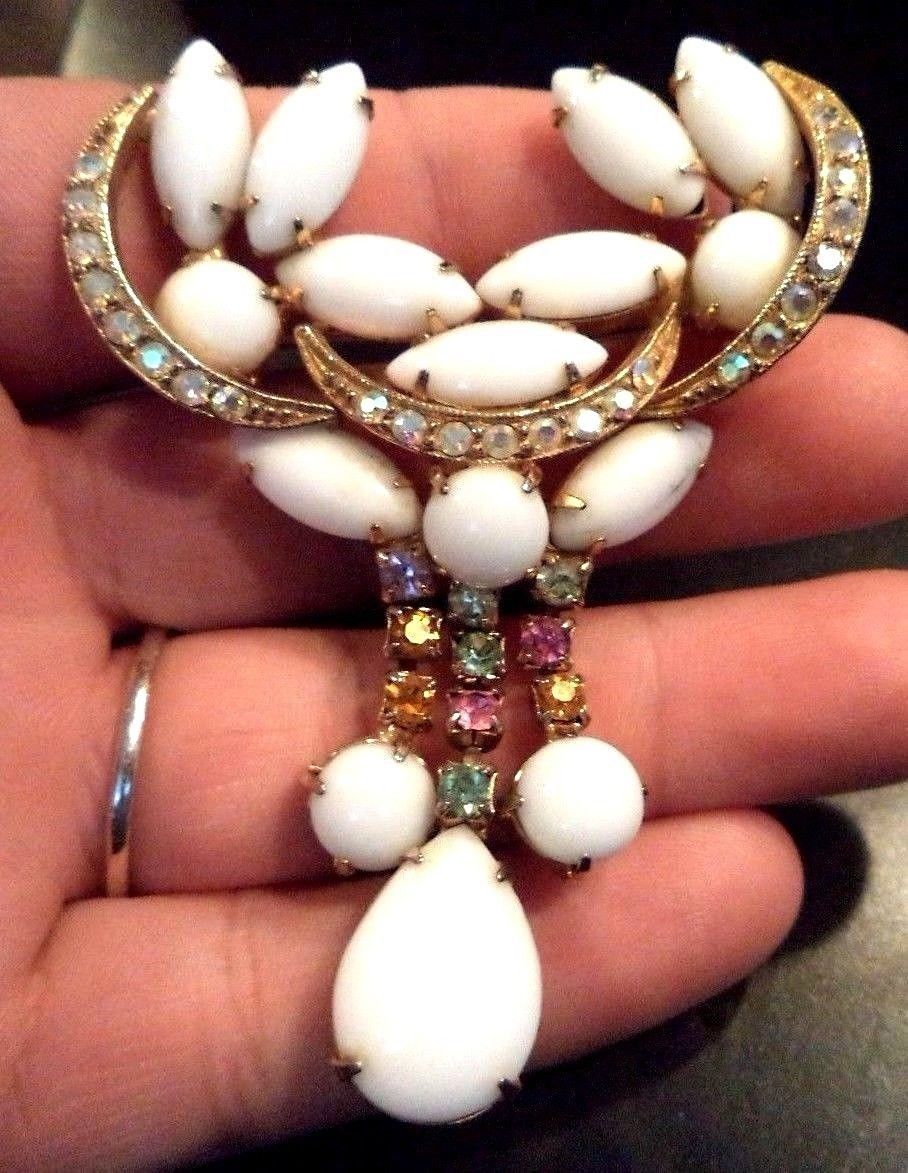 Title (ebay affiliate link): *RARE* VINTAGE ESTATE JULIANA D&E MILK GLASS RHINESTONE FLOWER 3" BROOCH! G6667P