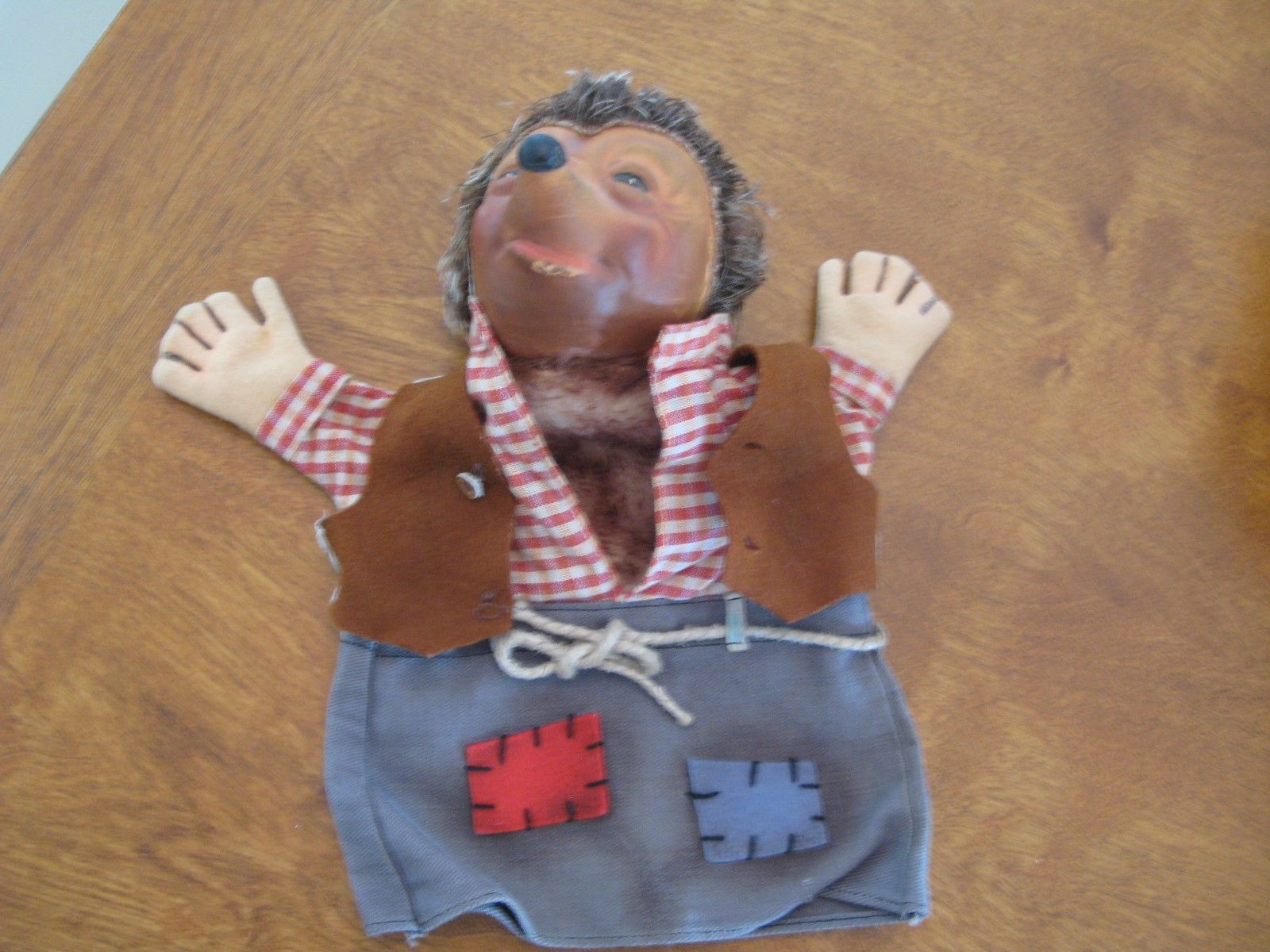 hand puppet vintage 10" bear toy play patches vest hedgehog hair steiff mecki