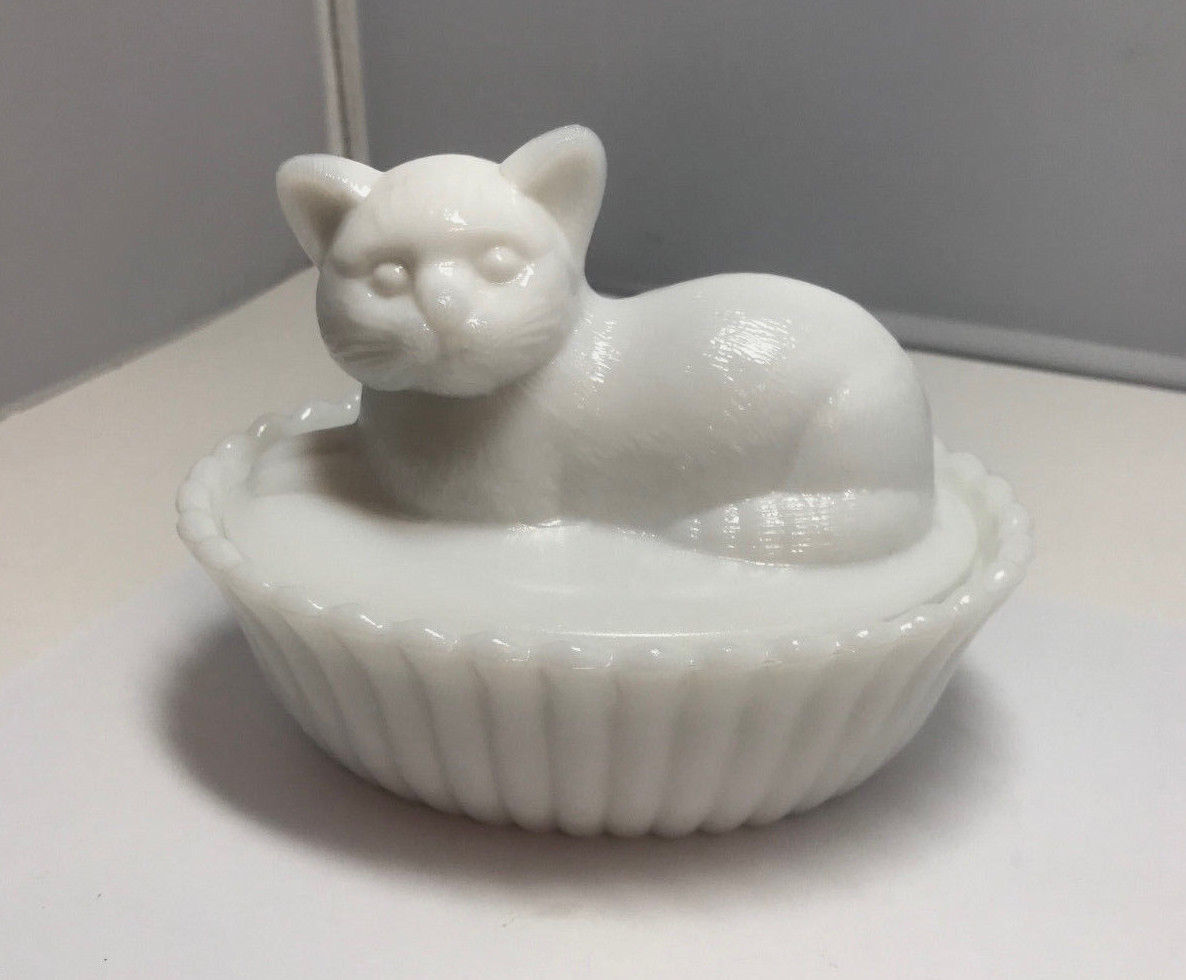 Title (ebay affiliate link): WESTMORELAND MILK GLASS KITTEN CAT ON RIBBED SCALLOPED BASKET CANDY TRINKET DISH