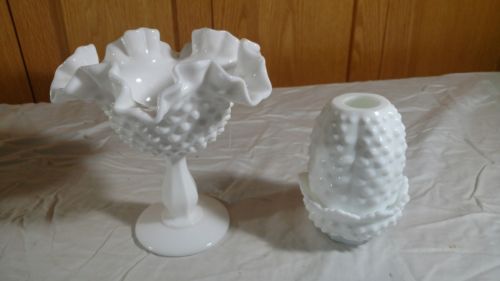Title (ebay affiliate link): VINTAGE FENTON White MILK GLASS HOBNAIL CANDLE FAIRY LIGHT LAMP and compote lot