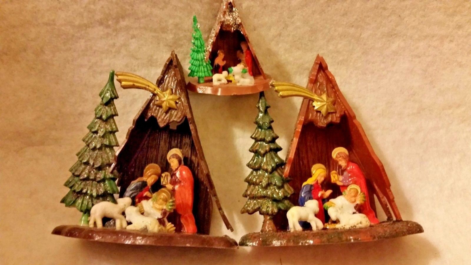 Title (ebay affiliate link): LOT VINTAGE SMALL CHRISTMAS ORNAMENT PLASTIC NATIVITY DIORAMA HONG KONG