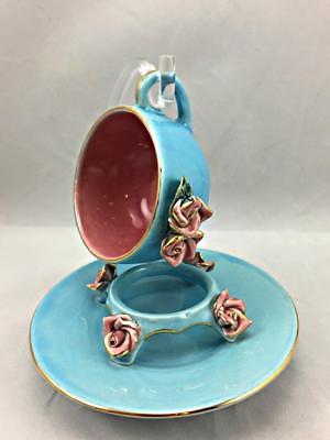VINTAGE TEA CUP AND SAUCER TURQUOISE BLUE W/ RAISED FLOWERS ROSES GOLD TRIM