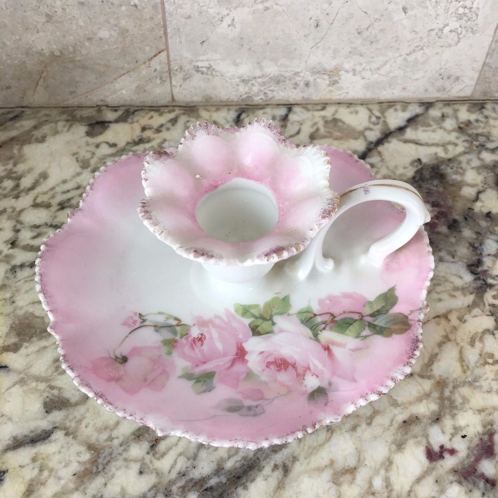 Title (ebay affiliate link): Antique Handpainted Old Fashioned Candle Holder--Pink with Roses--Germany