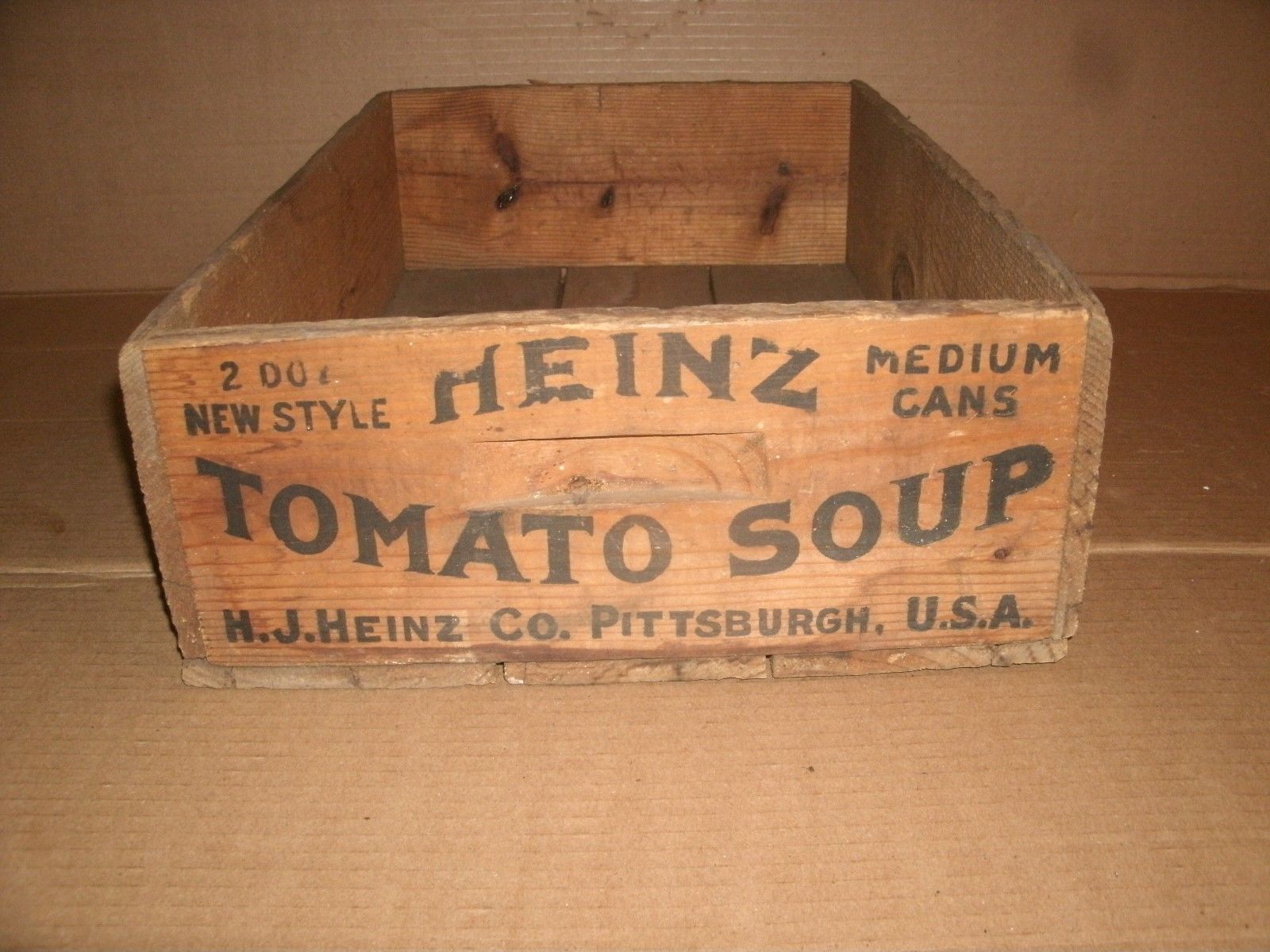 Title (ebay affiliate link): Vintage Heinz Tomato Soup WOODEN BOX CRATE Industrial Steampunk Sign Board Side