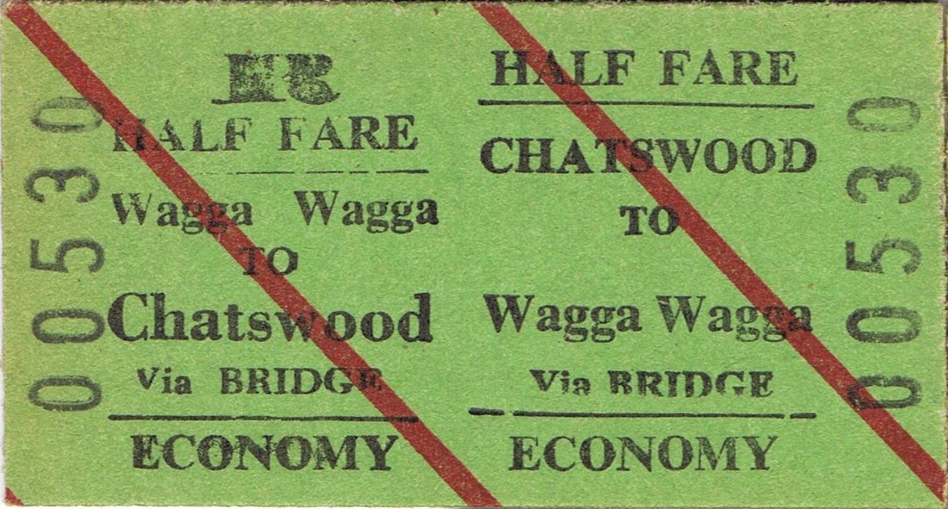 Title (ebay affiliate link): Railway tickets NSWGR Chatswood to Wagga Wagga half fare economy return unused