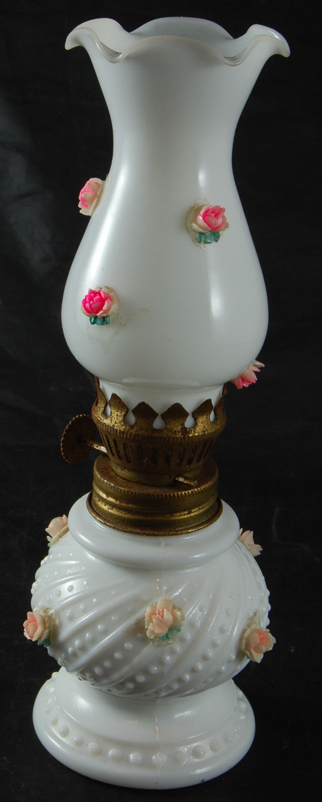 Title (ebay affiliate link): Vintage Miniature Oil Lamp - White Glass Base and Shade with Pink Flowers