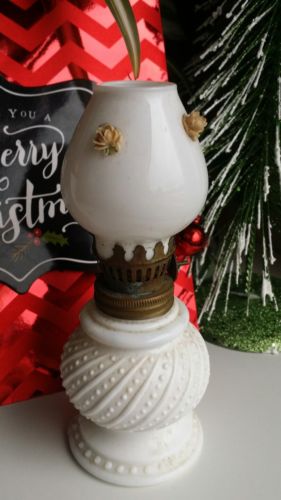 Title (ebay affiliate link): Small White Milk Glass Vintage Paraffin Oil Lamp with pretty roses Pixie Shade