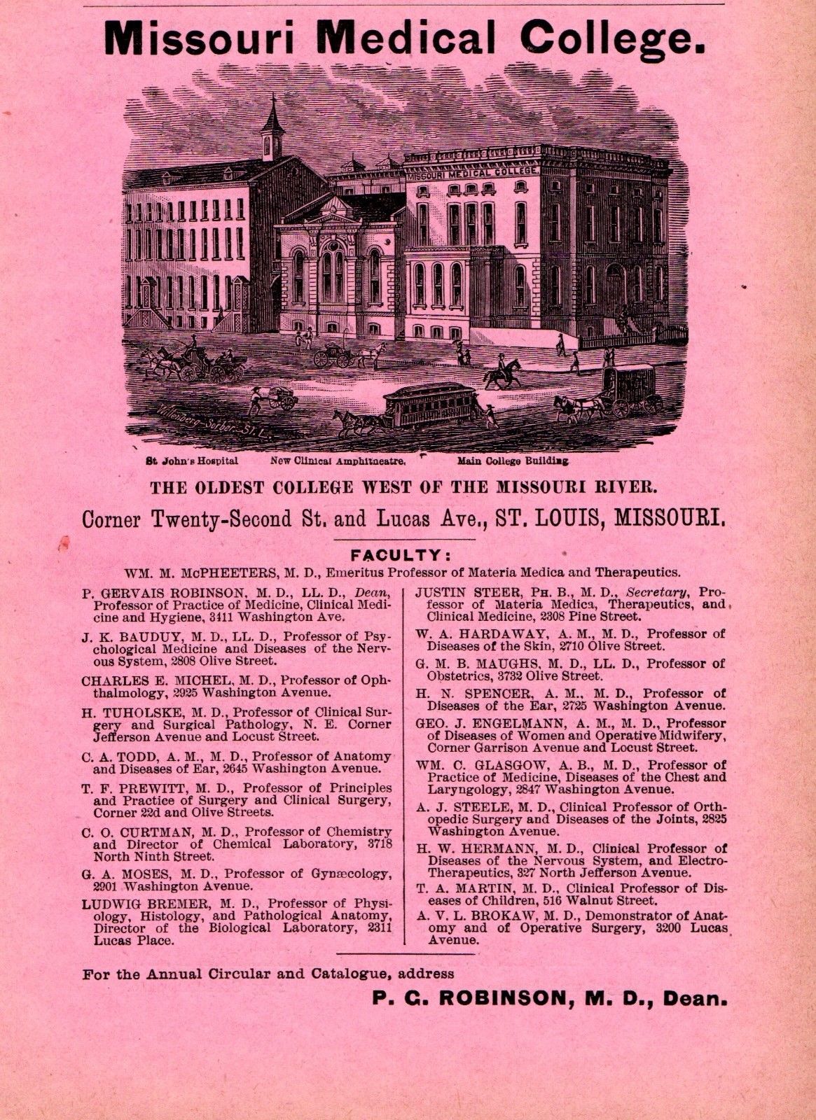 1890 MISSOURI MEDICAL COLLEGE, ST LOUIS, MISSOURI COLORED PAPER ADVERTISEMENT