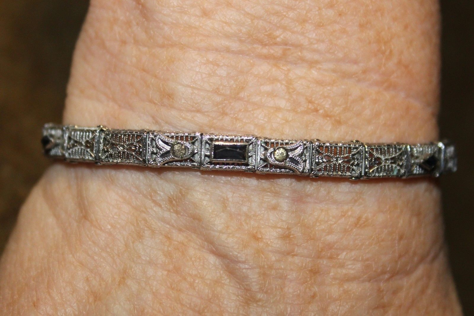 Title (ebay affiliate link): 1920''S ART DECO FILIGREE RHODIUM PLATE BRACELET BY JOHN H. PECKMAN
