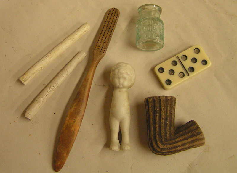Assorted privy finds bone toothbrush domino doll part clay pipe and stems
