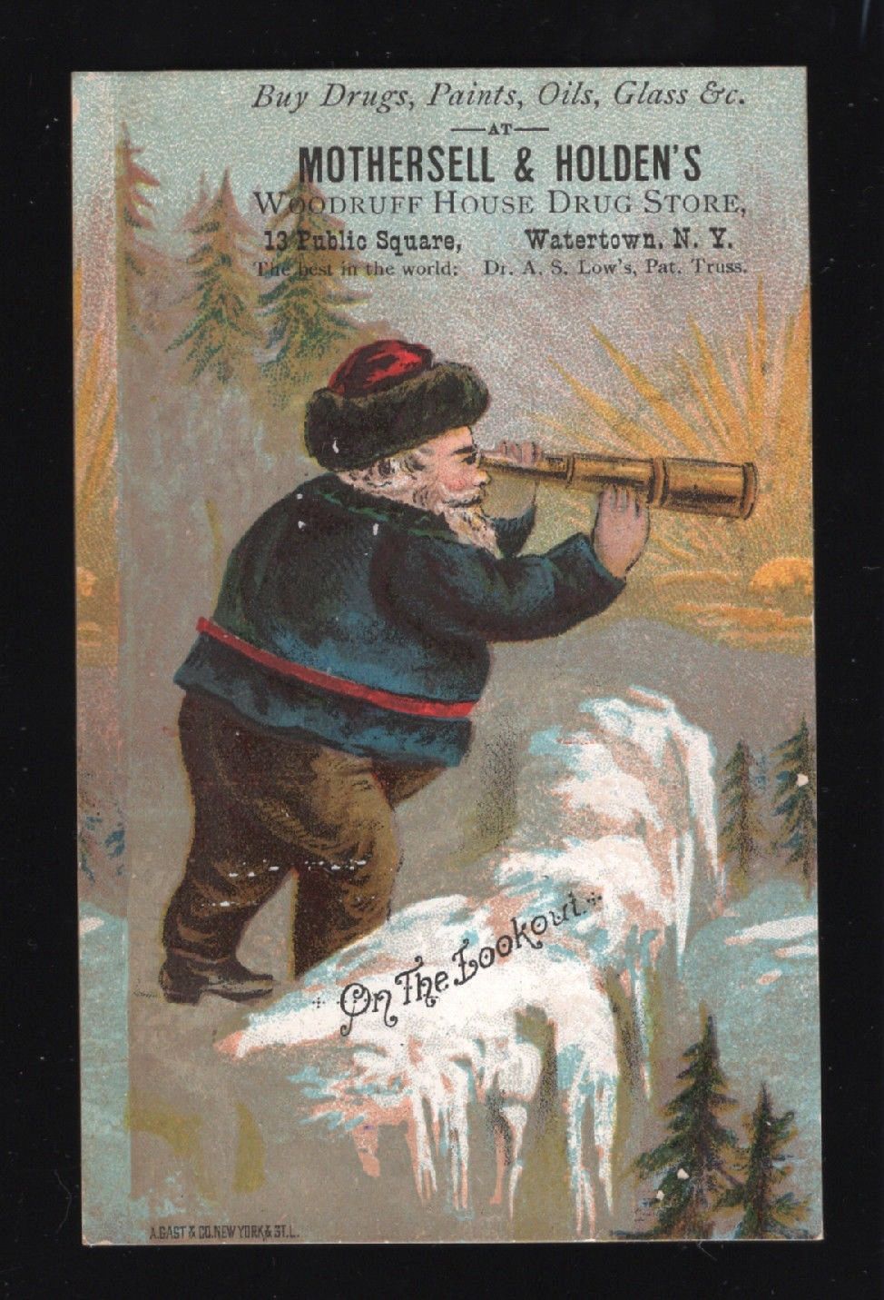 1870s Trade Card - Blue Coat Santa Claus On The Lookout - Watertown NY