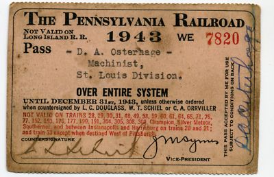 1943 The Pennsylvania Railroad Pass D. A. Osterhage