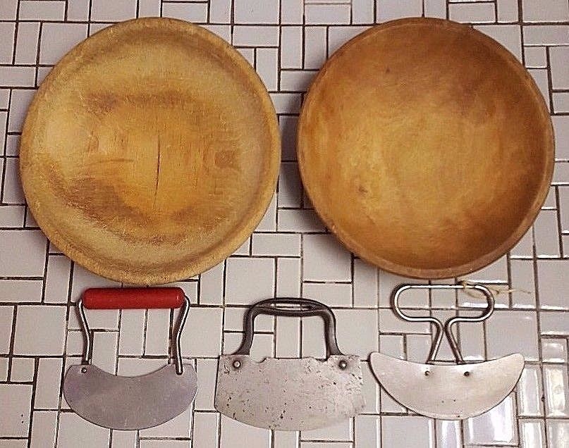 Title (ebay affiliate link): True Vintage Wood Chopping Dough Bowls (2) Out of Round and Hand Choppers (3)