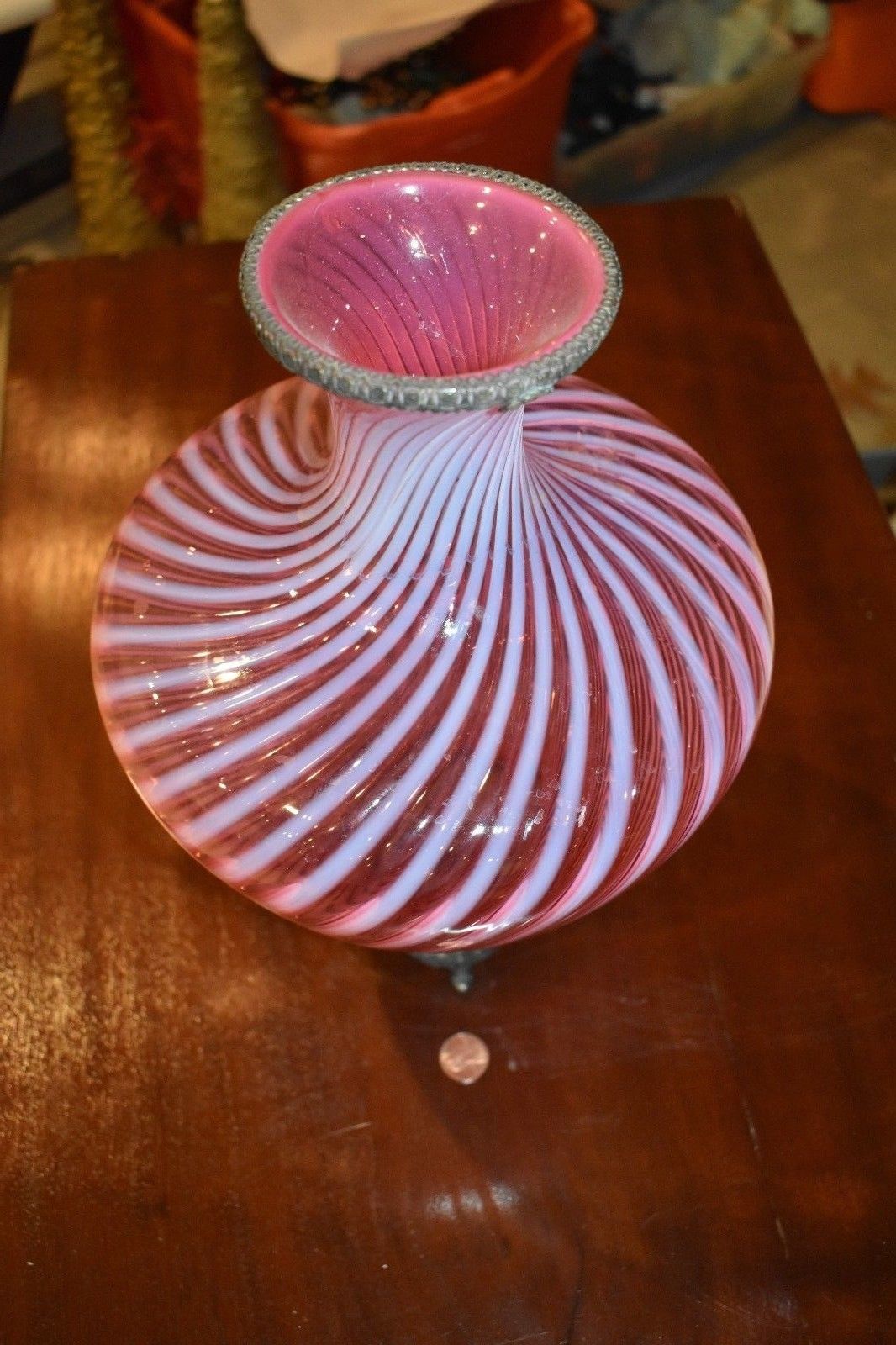 Antique Spiral Glass Vase with Bronze Lip and Feet 24 Hour Listing No Reserve
