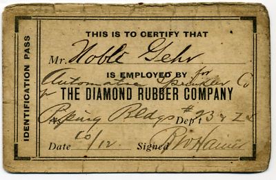 1912 Employee ID Pass Diamond Rubber Co. Noble Gehr