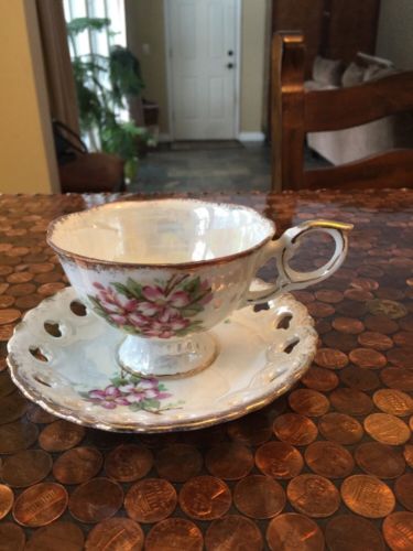 Title (ebay affiliate link): Vintage Tea Cup and Saucer Set Lusterware Pierced Dish Reticulated Floral Footed