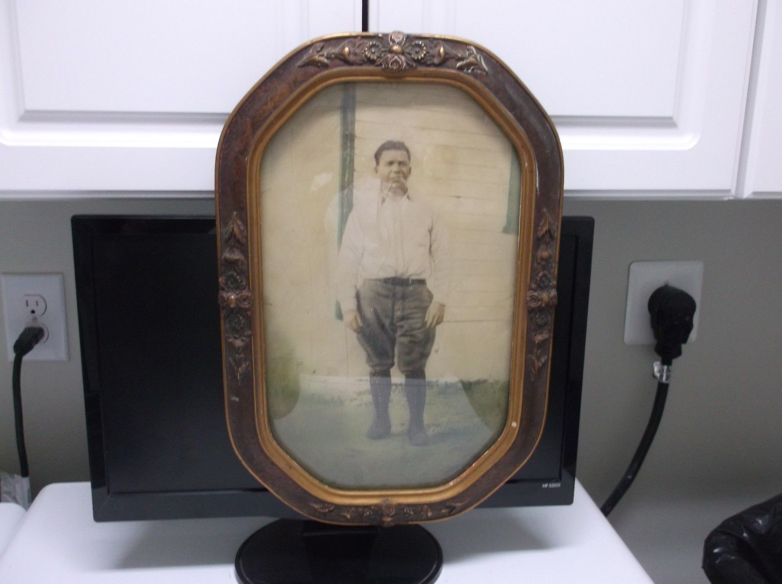 Vintage Convex Bubble Glass Oval Wood Picture Frame With Man
