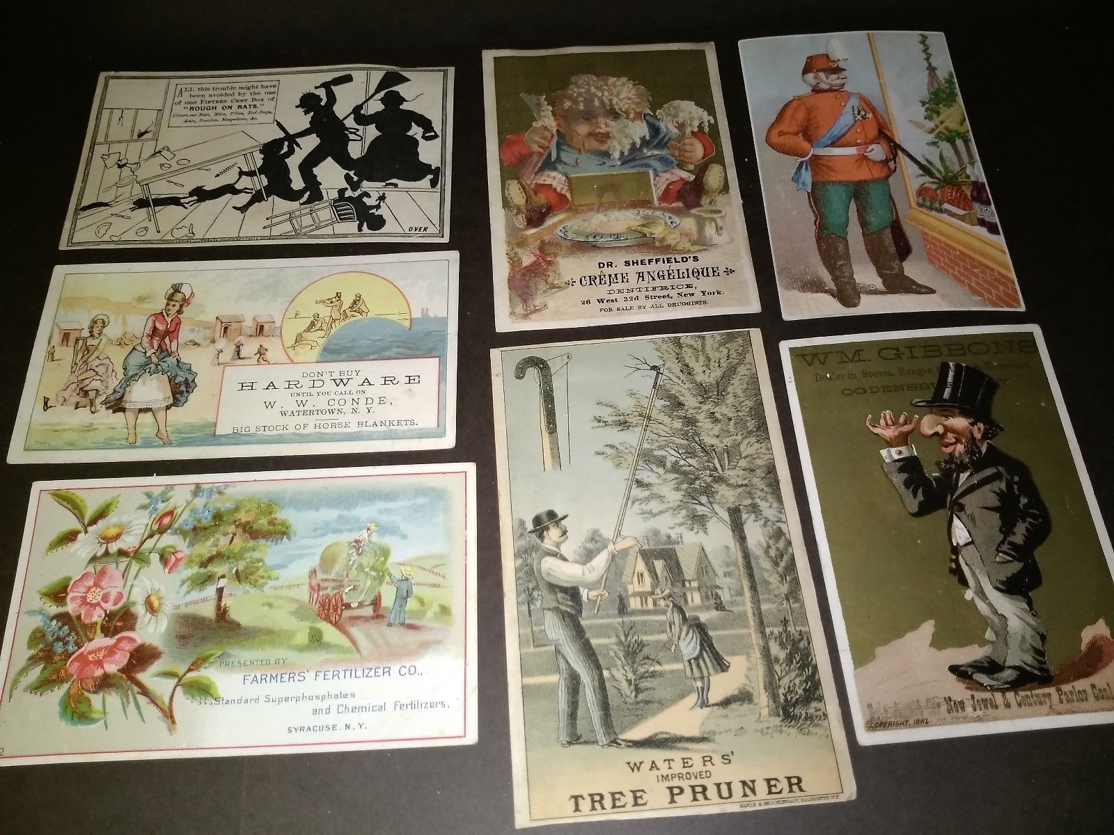Victorian Advertising Trade Cards Lot of 7 including Waters Pruner, Rough on Rat