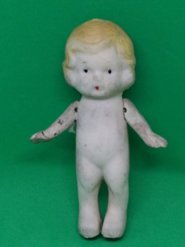 Title (ebay affiliate link): Tiny Antique Bisque Doll 3.5" Tall Arms Move Blond Hair Signed Japan 1940s
