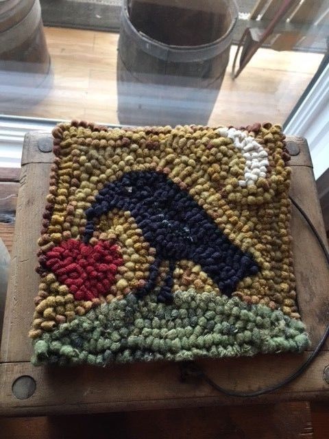 Primitive Crow and Heart Hand-Made Hooked Rug