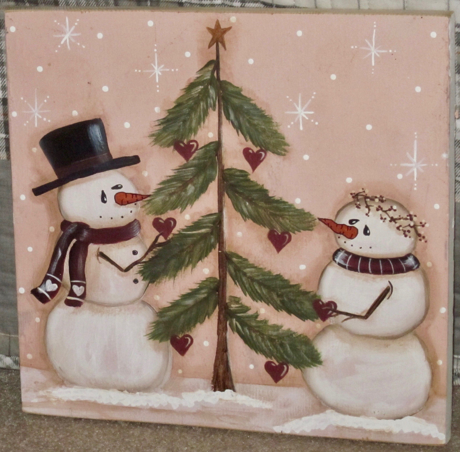 Title (ebay affiliate link): *~*PRIMITIVE*~* HP FOLK ART PRIM SNOWMEN COUPLE*~* HEART TREE *~* RECLAIMED WOOD