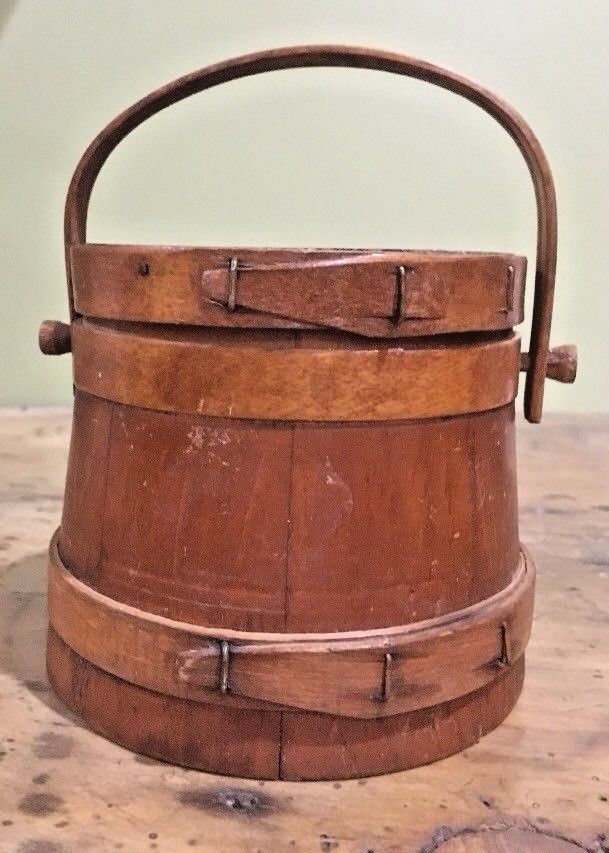 Title (ebay affiliate link): Vintage Primitive Small Handheld Firkin Sugar Bucket Wooden decor Farm Cottage