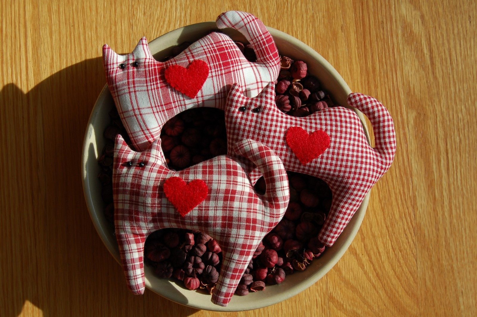Title (ebay affiliate link): Primitive Valentines Day Homespun Cat Ornies w Heart Applique