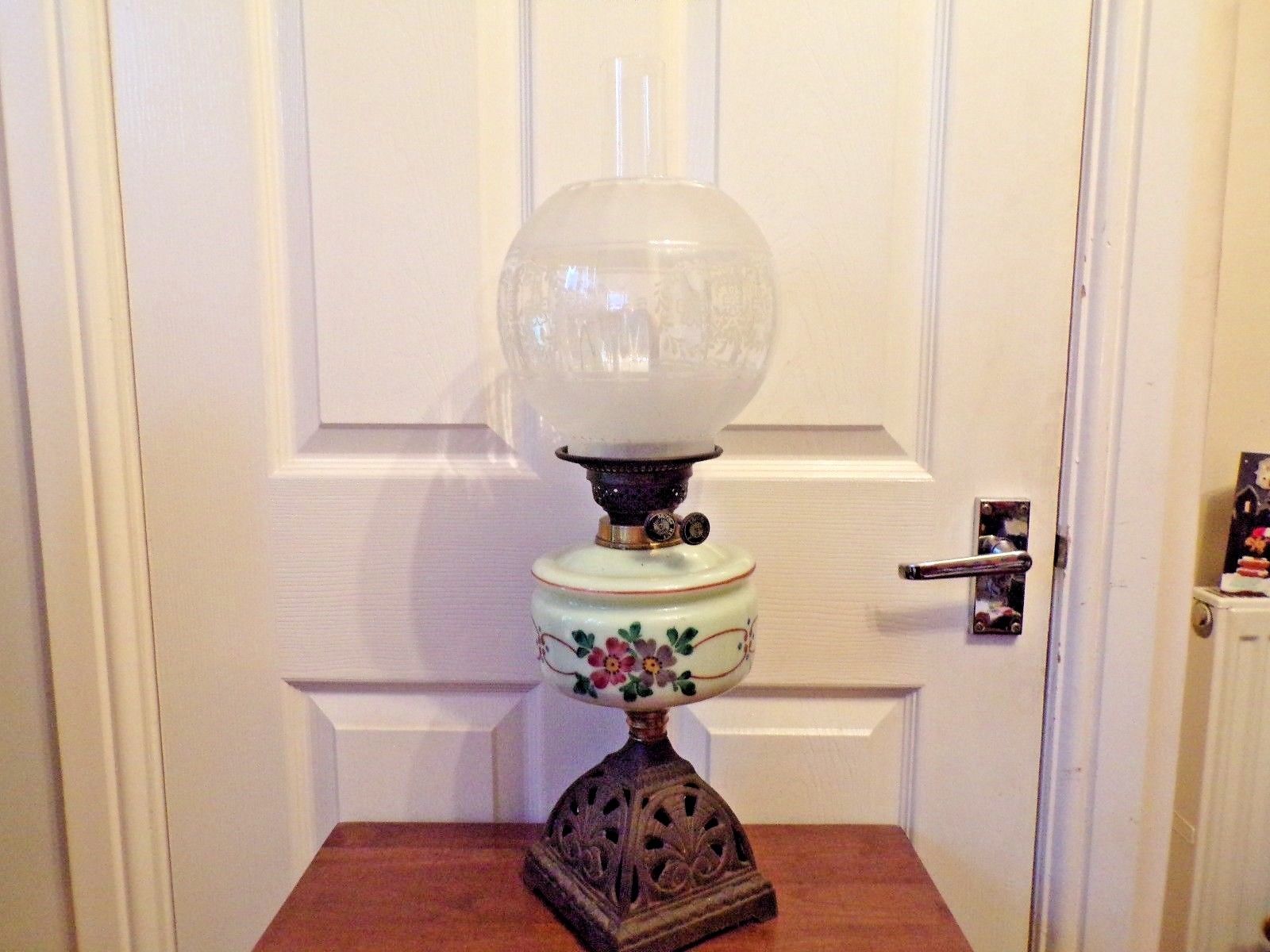 A Victorian oil lamp with cast iron base with frosted glass glass globe working